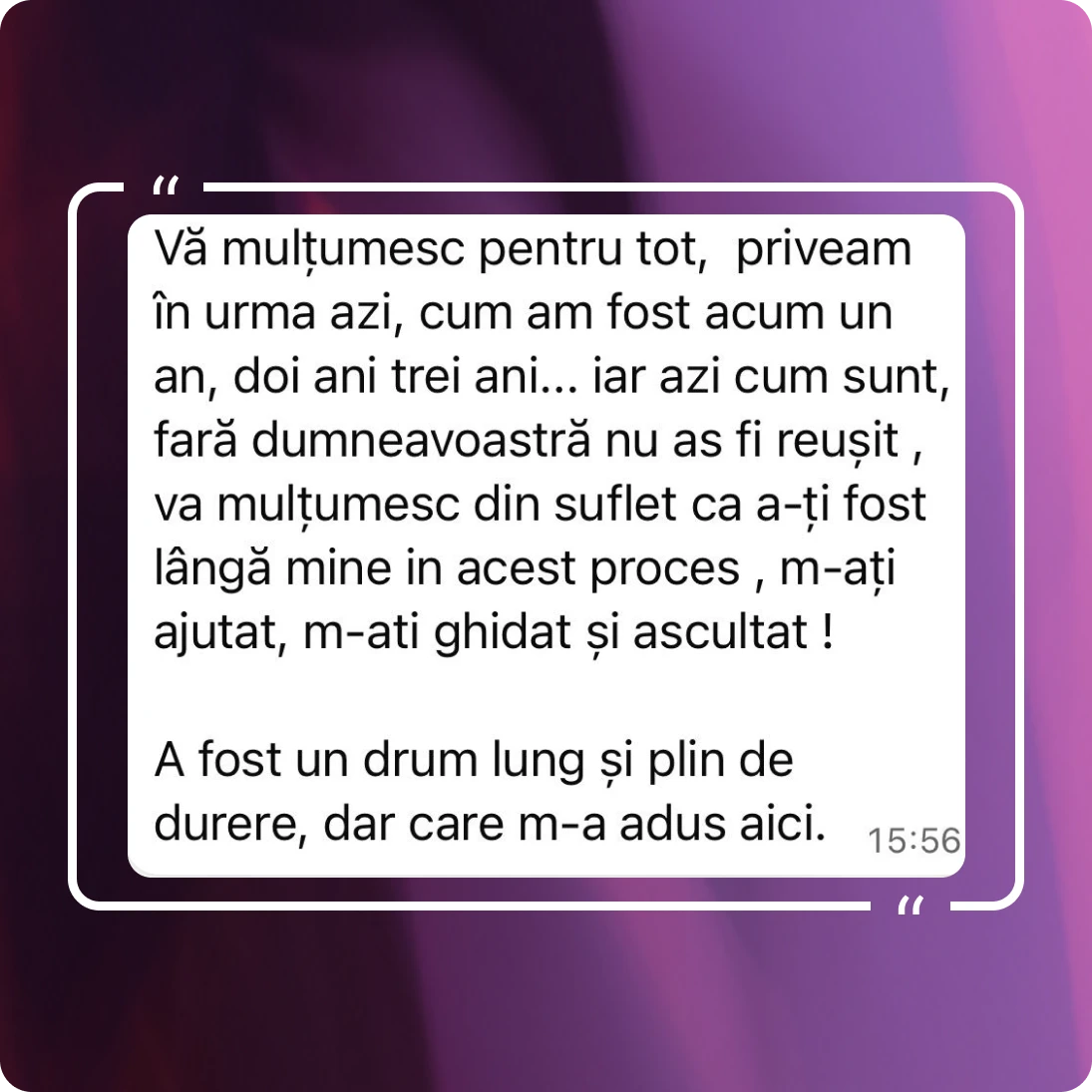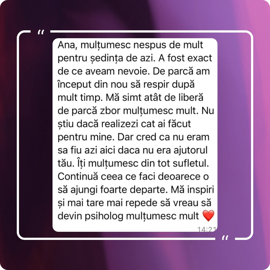În cabinet creez un spațiu sigur, empatic și confidențial, în care fiecare persoană este ascultată fără judecată. Cred că schimbarea reală începe atunci când ne permitem să ne privim cu sinceritate, să ne asumăm responsabilitatea și să dezvoltăm curajul de a fi imperfecți, dar autentici.